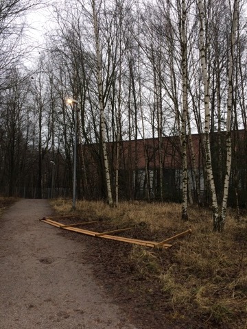 Suomenojan Luonnolle lähetettiin joukko kuvia (kiitos tuntematon ystävä, joka antoi luvan käyttää kuvia), joissa näkyy rikottuja taulutelineitä (taulut onneksi talvisuojassa) ja altaaseen heitetty penkki. Taulutelineitä on tuhottu aiemminkin. Jollakin on kiva joulumieli.