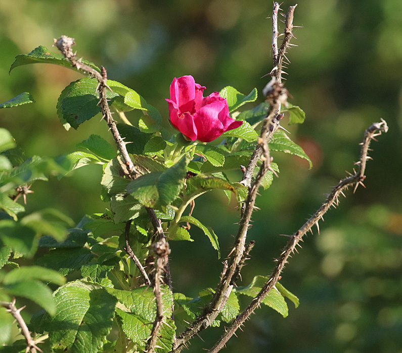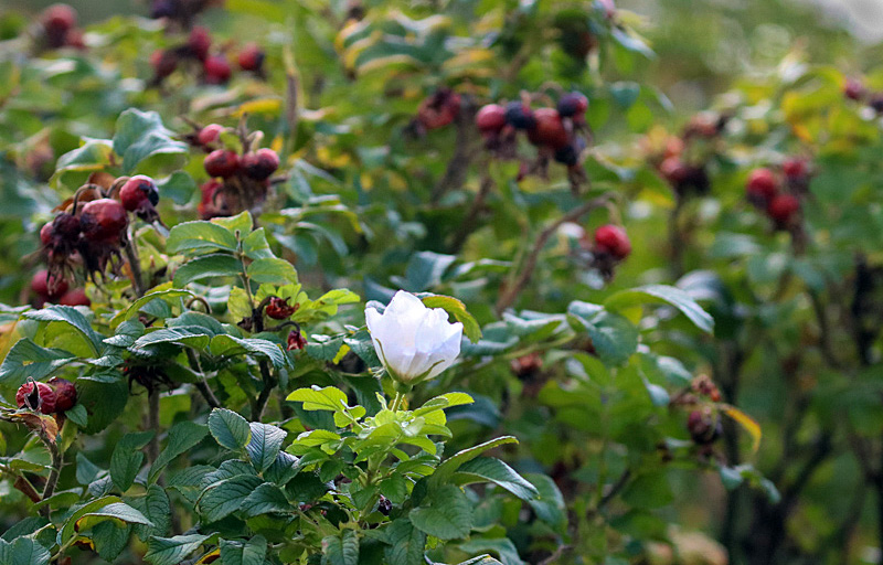 Myös kurtturuusu voi innostua syksyllä yksittäisesti kukkimaan, nyt löytyi yksi valkoinen ja yksi punainen kukka.