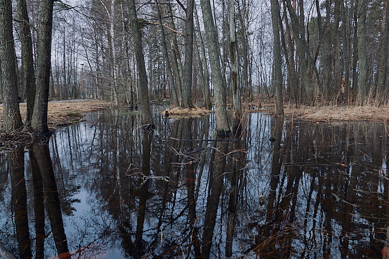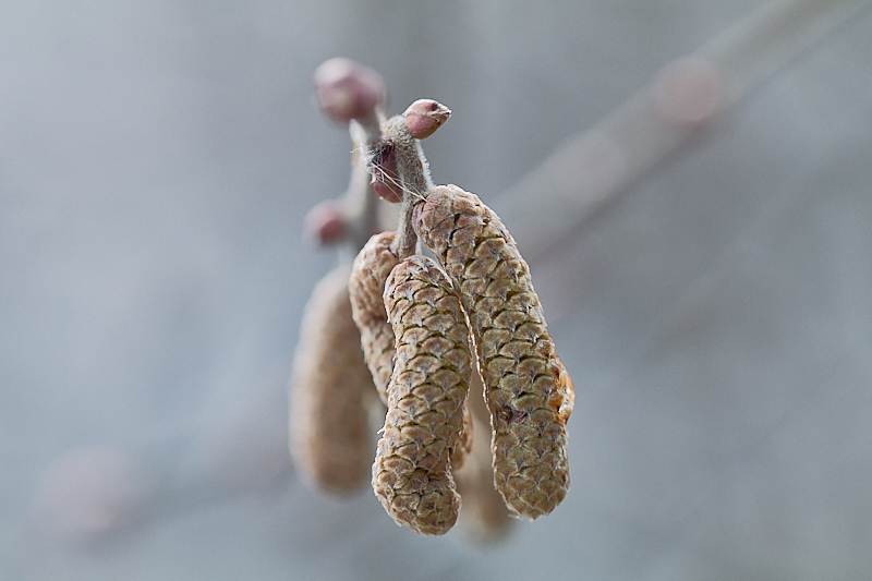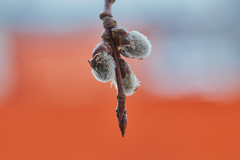 Vähitellen kuitenkin lämpeni ja kuluneella viikolla voitiin todeta, että etelänruttojuuret voivat hyvin ja nuputkin ovat jo näkyvissä. Alkuja on myös noussut lisää. Myös japaninruttojuuret ovat heräämässä. Alkuja on runsaasti. Sulava lumi toi Nuottalahden metsikköön (ns. tallitien metsään) suurehkoja vesilätäköita, jotka olivat jo lähes lampareita. Pajunkissoja on nyt runsaasti, vaikka joukossa on vielä runsaasti kuolleita lehtiä viimevuodelta. Kun pajunkissat avautuvat pikkuhiljaa ja sää on kostea vesipisarat muodostuvat kauniisti niiden päälle. Pähkinäpensas on kukassa Tiistilän metsän reunalla ja tallitien metsässä.