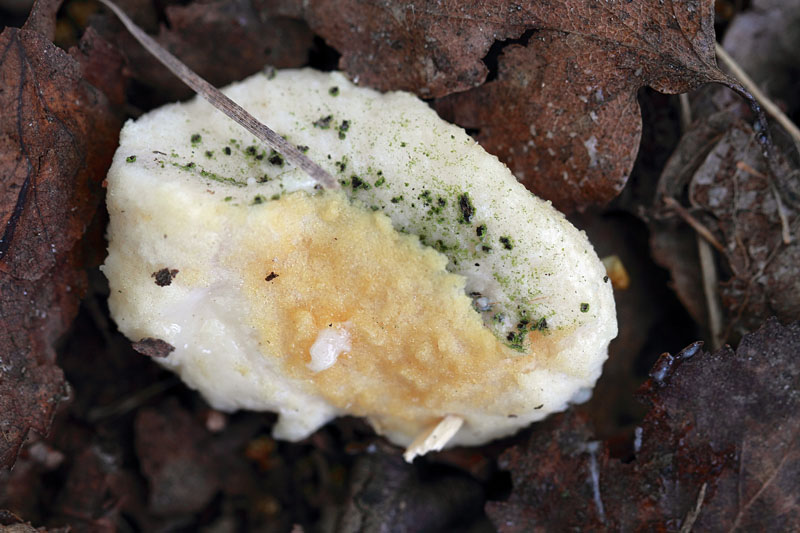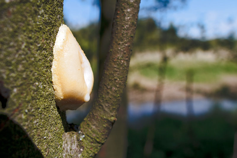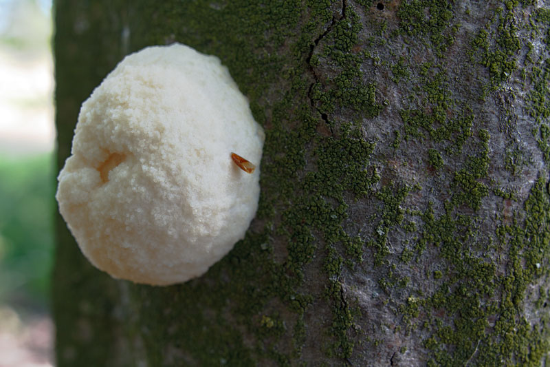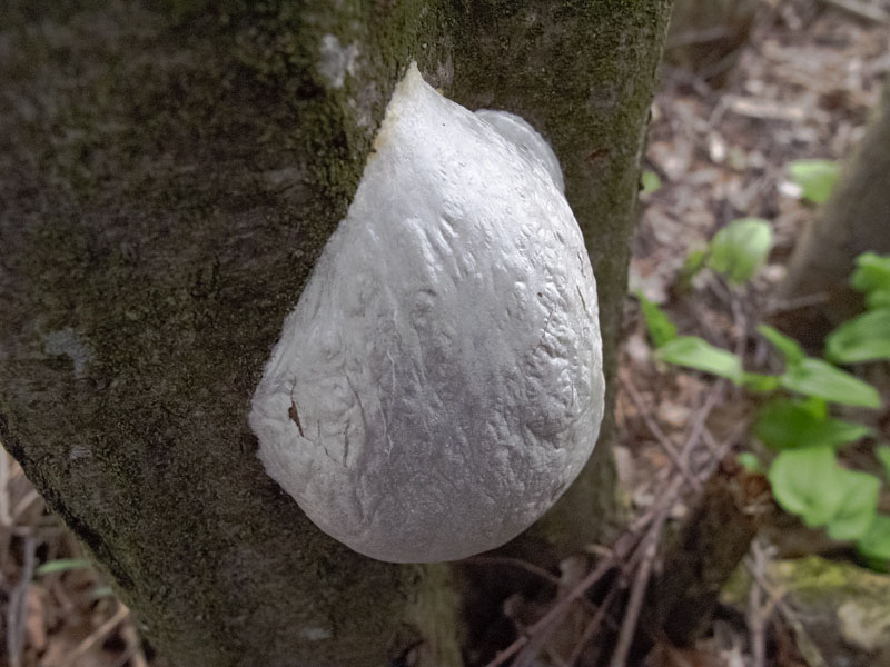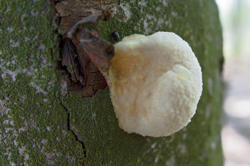Eilen sitten onnisti Ressujen retken yhteydessä. Olin muistanut puun oikein. Oli ilmaantunut uusia, tosin aika pieniä verrattuna viime viikon yksilöön. On luonteeltaan kuin vedellä täytetty ilmapallo. Kun painaa, tulee vaikutelma, että painallus saa aikaa nesteen siirtymisen. Tarpeeksi lujaa painaessa tulee lommo ja nestettä alkaa tippumaan ulos (kuva2). On tosiaan kuin pussi – ei ole sienimäistä hattua ja pillimäistä alapuolta, kuten käävälläkin on. Nuori, pieni yksilö (noin 3-5 cm ylhäältä alas) on kuin mannapuuroa (kuva3 ja 4). Varttuneemmalle on on tullut tuo ilmapallokalvo, kuten seisoneelle vellille, mikä näkyy kuvassa 2. Kun yrittää leikata siivua, irtoaa koko pussi. Kiinnitysalue muistuttaa nahkiaisen suuta (kuvat 5 ja 6).