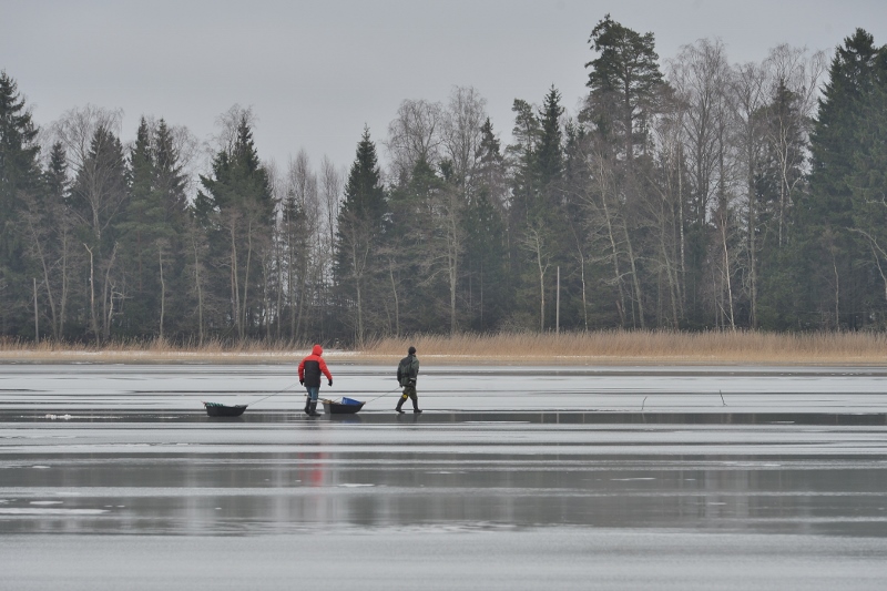 Vaikka on ollut lämmintä ovat kävelytiet osin petollisen jäisiä. Vähäinen lumi on aikoinaan taallantunut kovaksi ja on nyt sitten jäätä. Ja uhkarohkeita riittää altaan jäätä kokeilemaan.
