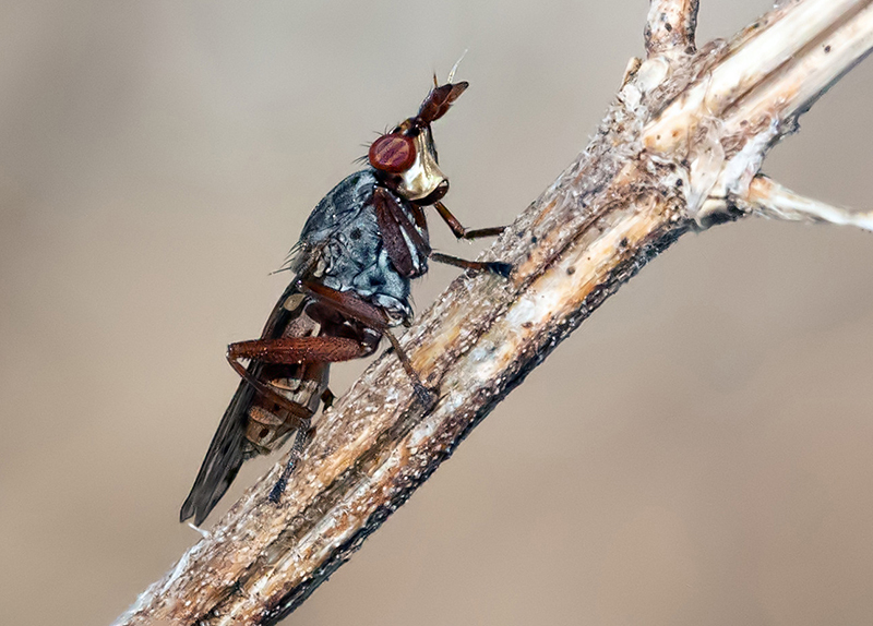 Maaliskuun 21. päivänä halusin tarkistaa, lentääkö lintualtaiden ympäristössä jo vuoden ensimmäisiä perhosia: talvihorroksesta heränneitä nokkosperhosia tai juuri kuoriutuneita koivutyttöperhosia. Niitä en ole nähnyt. Sen sijaan löysin värikkään kärpäsen: Elgiva cucularia. Sen toukat loisivat makean veden kotiloissa. Suomessa tästä lajista on tehty 218 havaintoa, eli se on melko harvinainen.