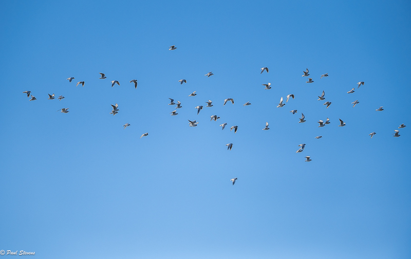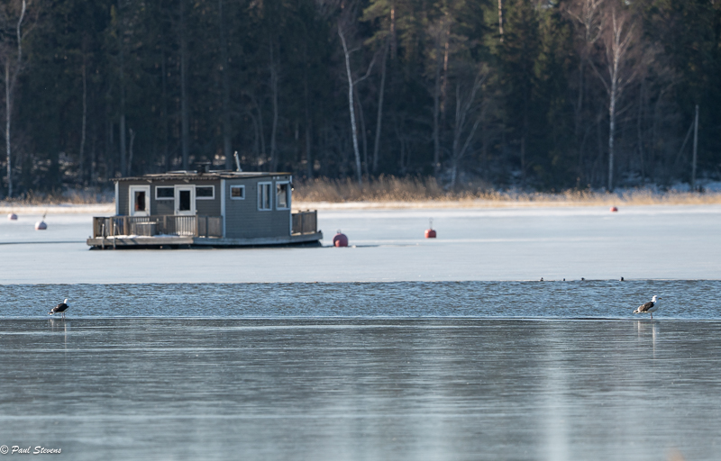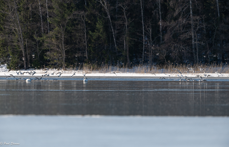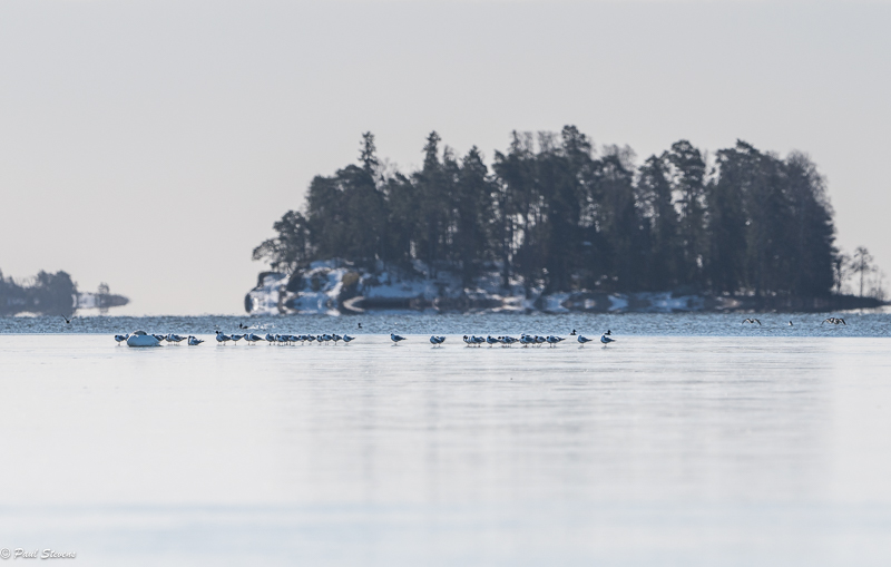 Jakson viimeisenä päivänä 2. huhtikuuta naurulokit saapuivat Nuottalahden jäälle. Merijää on sulamassa vauhdilla, muuta vielä on ohut jääkerros avoimen meren reunalla. Siellä pieni naurulokkiparvi lepäili ennen kuin ne jatkoivat matkaansa. En tiedä mihin ne menivät, mutta eivät menneet altaille, jotka ovat vielä umpijäässä. Jakson loppuvaiheessa Nuottalahden vedessä oli myös kyhmyjoutsenia, tukkasotkia, merimetsoja ja pari merilokkia.