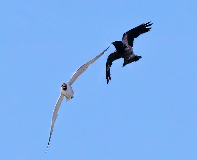 - Naurulokki hätyyttää ylilentävää varista – Kuva Esa Mälkönen