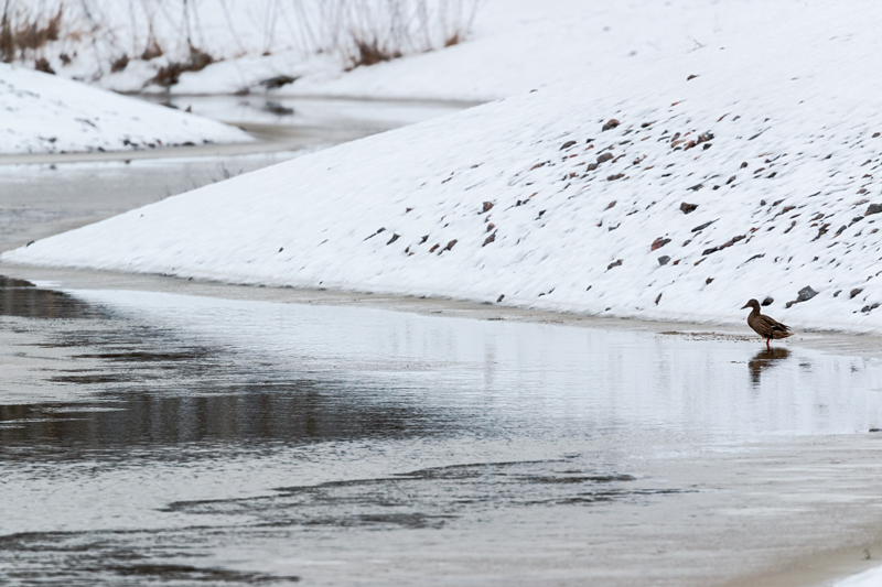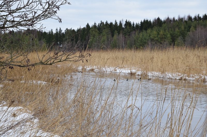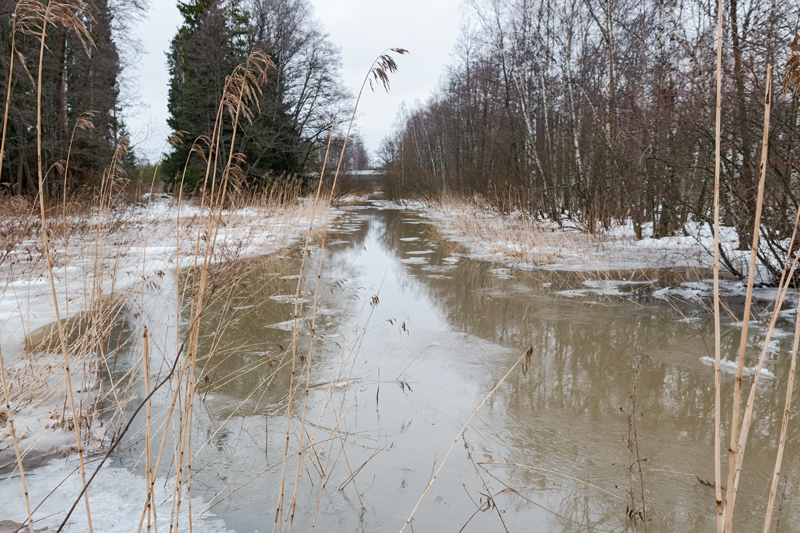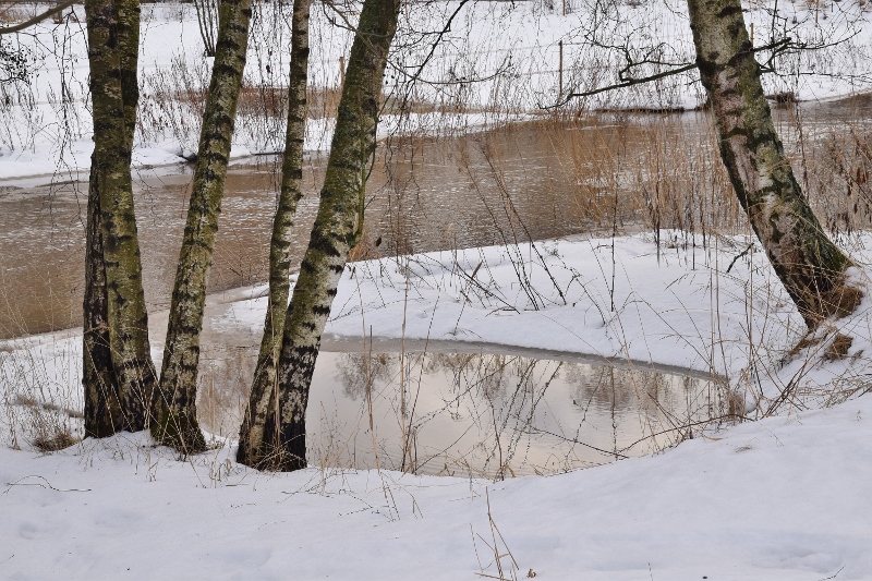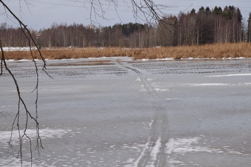Pakkanen muuttui rysäyksellä plussan puolelle ja satoi vettä. Lumi suli ja vettä oli paljon puroissa, ojissa ja parkkipaikalla. Kävelytiet jäätyivät paikoin vaikeaksi kulkea ja hiihtoladut olivat vain valjuja jälkiä.