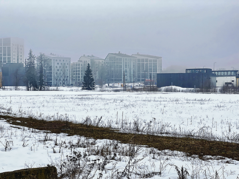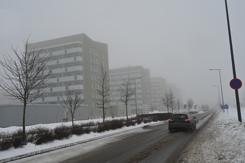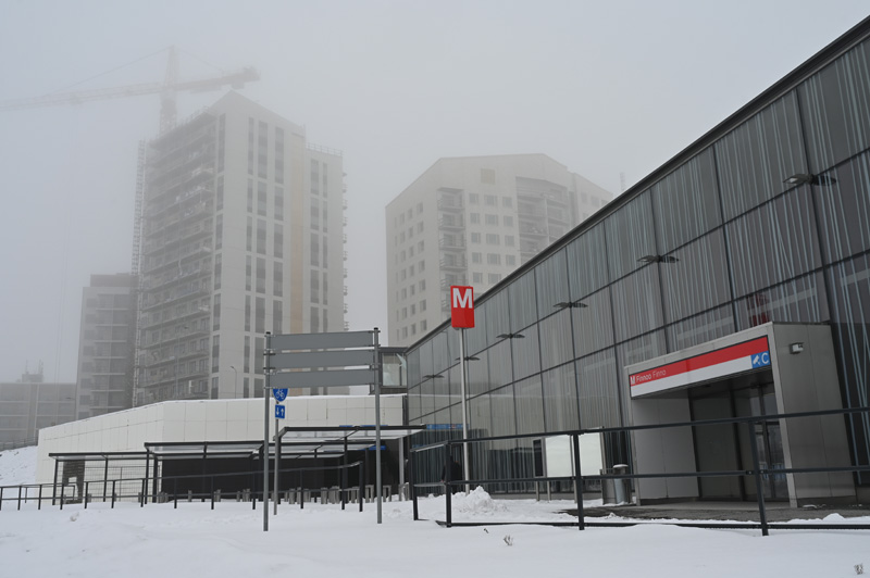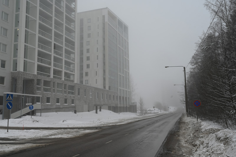 Rakentaminen jatkuu kaikkialla Finnoon alueella. Helmikuussa esiintyvät tiheät sumupäivät loivensivat rakennusten massaa ja korkeutta.