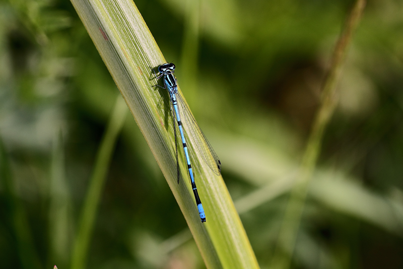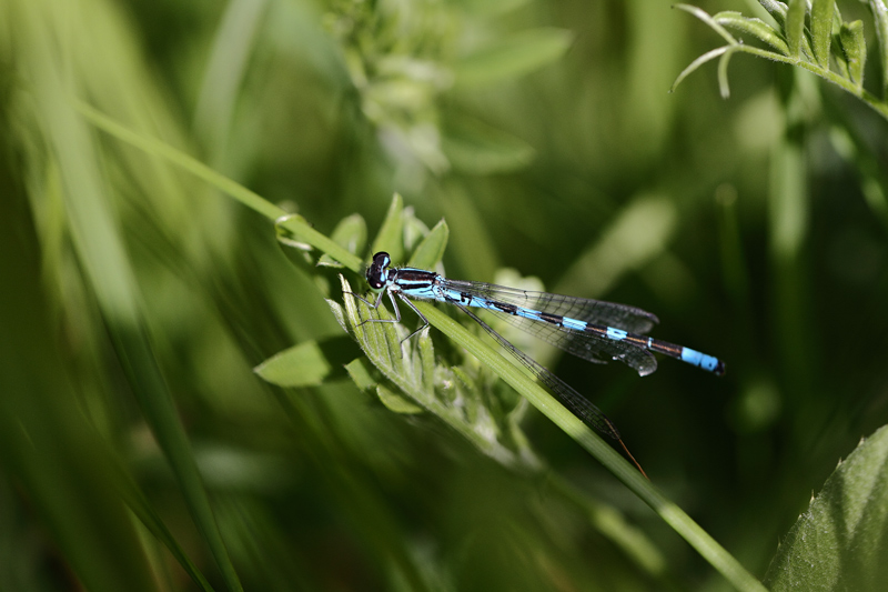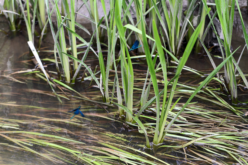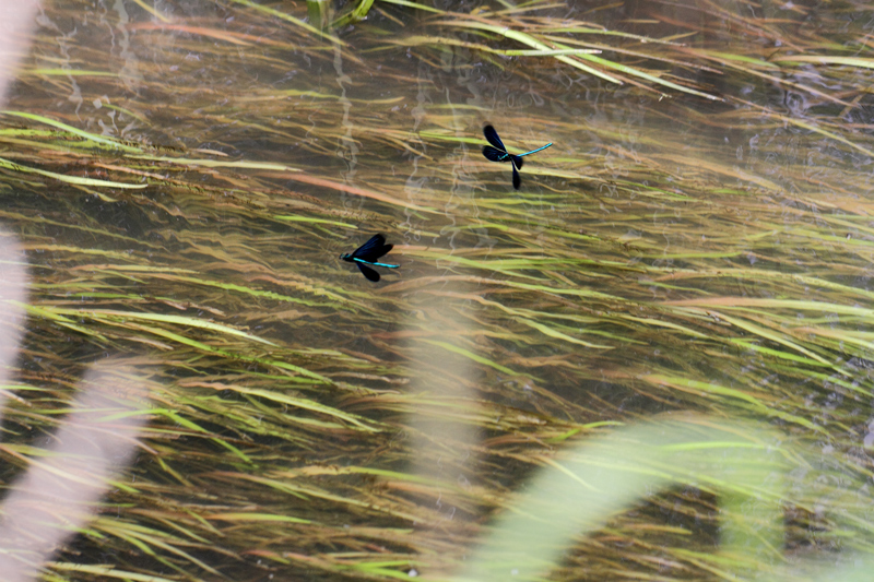 Ja kohta on näky kuin suoraan Sami Karjalaisen kirjasta: toistakymmentä neidonkorentoa liihottelee ja kisaa puron päällä. Vahinko, että ovat puron toisella puolella ja 100mm makro ei oikein riitä kuvaamiseen. Törmä on jyrkää ja mahdoton laskeutua alas. Haavat leuassa, kädessä ja jalassa muistuttavat viikon takaisista lipoista, turhasta rohkeudesta ja ahneudesta. Joten olen varovainen ja tyydyn siihen, mitä törmältä on mahdollisuus tehdä.