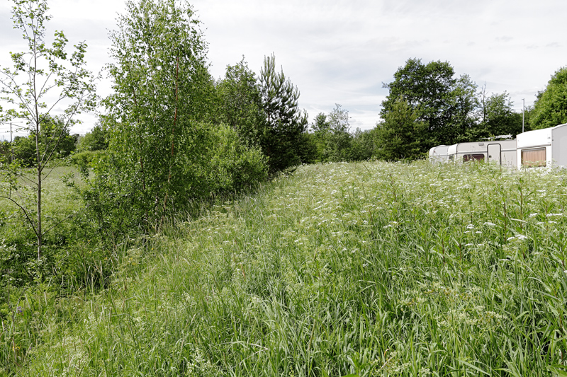 Puolarmaarin ryhmäpuutarhan jälkeen uoma häviää jälleen kasviston sekaan. Puolarmaarin karavaanariparkin kohdalla on vaikea havaita, että jossain putkien, marunoiden ja horsmien joukossa on potentiaalisesti vuolas puro. Päähaaran kohtaaminen tapahtuu syvällä pensaiden seassa. Päähaaran ranta on itäpuolella ryteikköä ja sitä mahdoton kulkea yläjuoksulle päin. Joten palaan karavaanariparkin kautta Puolarinrielle ja lähden kulkemaan läntistä törmää ylöspäin.