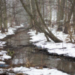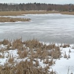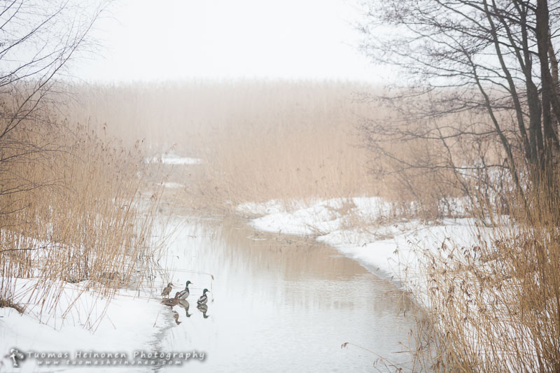 Allas on edelleen tukevassa jäässä. Tuomas yritti hakata reikää, mutta luovutti 10+ cm kohdalla. Finnoonpurossa näytti vesi virtaavan ylöspäin. Syynä lienee meren jääpeite ja puron jään päälle muodotunut lumien sulamisvesi. Sinisorsia oli purossa 10 kpl työmaan ja meren välillä.