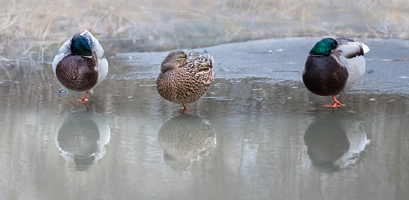 Esa Mälkönen kertoo: ”Heti kun puro muutamana leutona päivänä suli, sinisorsat palasivat. Ne tekevät joka päivä tarkistuslentoja ja laskeutuvat, jos purossa on sulaa. Puro on niiden kannalta suojaisa ja ruokaisa paikka.”
