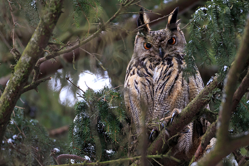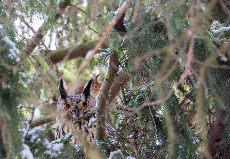 Ruokinnalla oli vielä kuvattavaa, kuten pörhistelevä koiraspeippo. Se oli täydessä juhlapuvussa, joten lintu on tullut muutolta. Punarinta ja hippiäinen olivat myös siellä puhumattakaan huuhkajasta, joka löytyi eräänä aamuna korkeasta kuusesta harakoiden ympäröimänä, oravakin kävi sitä ihmettelemässä. Huuhkaja viipui siellä iltapäivään, kunnes kyllästyi varislintujen häirintään.