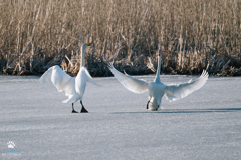 - Laulujoutsenet altaalla. Kuva Tuomas Heinonen