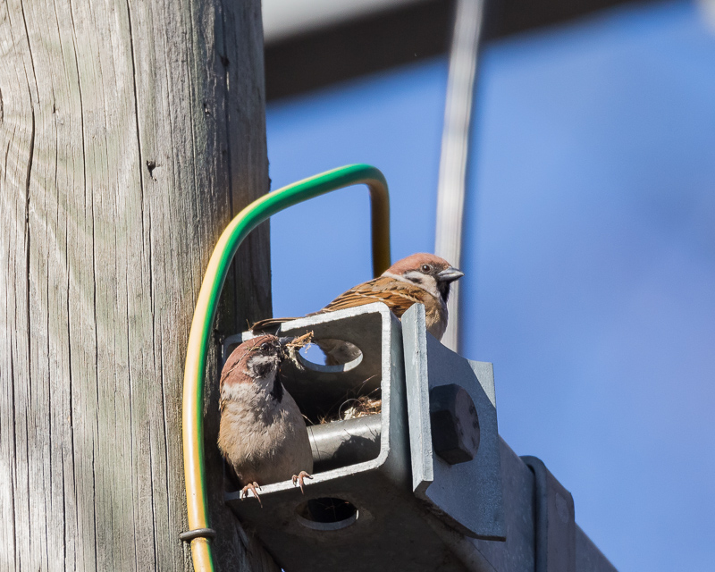 Pikkuvarpuset ovat pesän rakennuspuuhissa eteläisen parkkipaikan vieressä olevassa muuntajatolpassa. Tolpassa kaksi teräspalkkia ja molemmissa palkeissa on pesintä menossa.