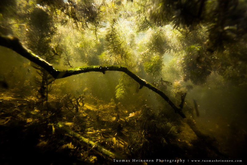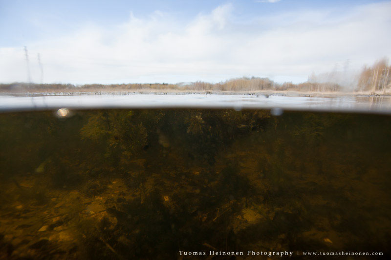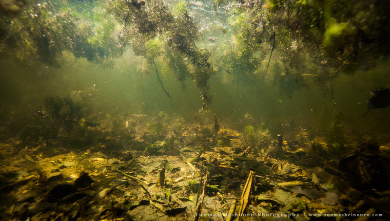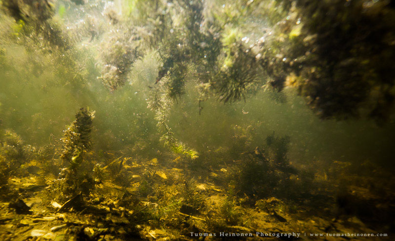 Toisella kuvauspaikalla huonosta tuurista johtuen minulla oli mukana ”erikoiskalustoa”, jolla lähdettiin hakemaan kuvia hentokarvalehdestä kuvia sen omassa ympäristössään eli altaassa. Altaan vesi on viime aikoina itäisellä ja pohjoisella puolella ollut tosi kirkasta, millä alueella hentokarvalehteä juuri kasvaa . Eli kurkistimme kamerani kanssa miltä ”maton” alla näyttää…