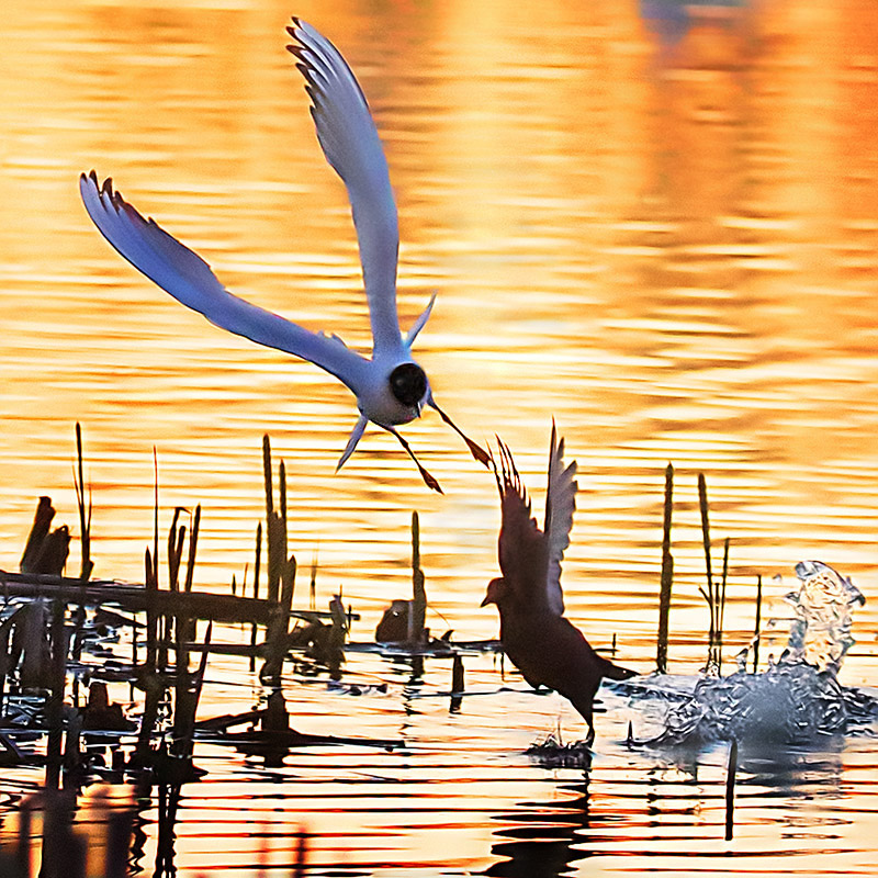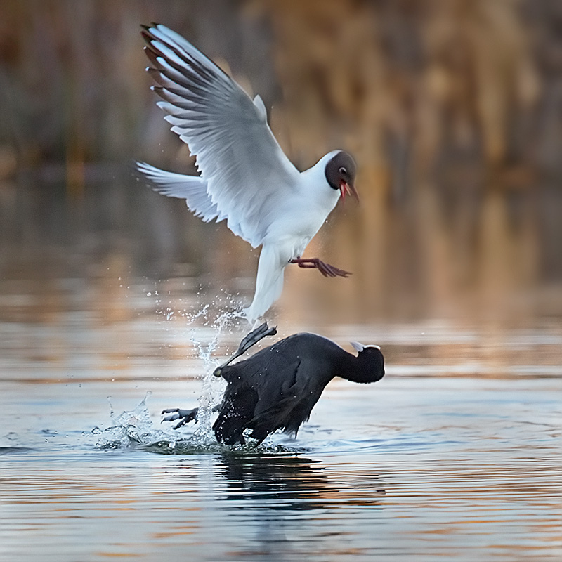 - Naurulokki hätistää liejukanaa – Kuva Esa Mälkönen