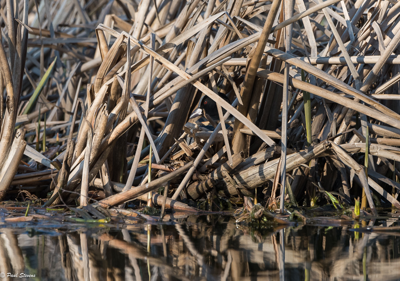 Nokikanapari on rakentanut pesän kaislikkoon paikkaan, mistä sitä on vaikea nähdä. Ainakin siellä on turvallista ja emo pystyy tarkistamaan, kuka tulee lähelle. Samalla alueella kuin nokikanan pesä liejukana oli kävelemässä ja se tamppasi maata. Yrittikö se häiritä pikku eläimiä, jotta ne tulisivat esille vai oliko sillä joku muu syy?