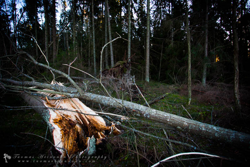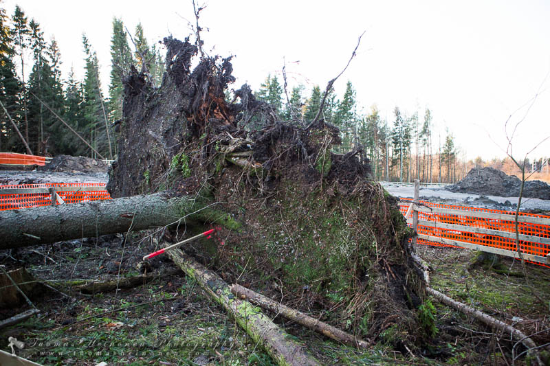 Sopiva tuuli pääsee nyt puhaltamaan pitkin tuulitunnelia otettuaan vauhtia varikon jälkeen tulvaniityllä. Jäljelle jäänyt metsä ei tällaista ole aiemmin kokenut, vaan se joutui seisomaan nyt eturintamassa suojamuurina. Roudaton maa, avoin tuulitunneli ja ennästyskovat tuulet osoittautuivat kohtalokkaiksi. Kuusien pinnassa olevat juuret eivät kestäneet koettelemusta, vaan puita kaatui kunnolla.