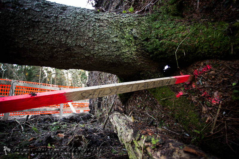 Jo Eino ja Oskari saivat aikaan noin 10-15 puun kaatumisen juurineen avatun väylän reunalta, Seija täydensi tuhoa. Nyt on kymmeniä puita nurin – valtaosa juurineen. Osa kaatuneista – tai oikeammin maasta irronneista – nojaa toisiin, vielä pystyssä oleviin puihin tai kaatuvat lopullisesti pienestä tönäisystä. Näky on aika erikoinen, mutta suosittu ulkoilualue on muuttunut hengenvaaralliseksi paikaksi.