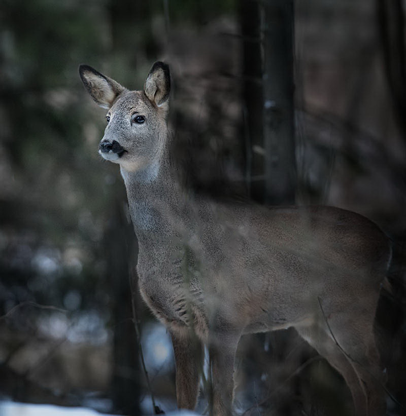 Yhtenä hämärähetkenä olin vielä ruokintapaikalla, kun silmäkulmaan osui lähestyvä kauris. Jähmetyin niille sijoilleni, sillä liike on se, joka paljastaa. Monien nisäkkäiden näkökyky ei ole kovin vahva, ja ne joutuvat luottamaan enemmän haju- ja kuuloaistiinsa. Metsäkauris lähestyi varovasti ja tuli noin kahdenkymmenen metrin päähän. Siinä vaiheessa erittäin hitain liikkein suuntasin kameran kaurista kohti. Se jotain huomasi ja ainakin kuuli kameran suljinäänet, mutta ei heti paennut. Vasta minuutin tilannetta pähkäiltyään poistui.