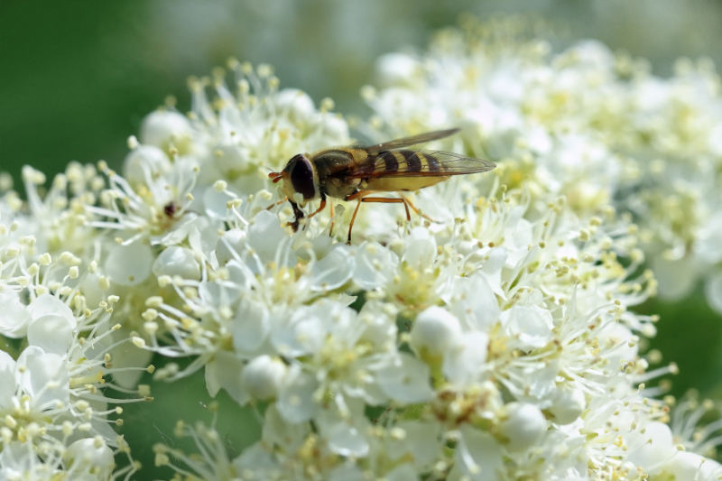 Pihlaja alkoi kukkimaan ja tuoksu on huumaava. Se houkuttelee paikalle pölyttäjiä. Kuvissani on kukkakärpänen, kuvioinnin perusteella niittykirvari nauttimassa pihlajan kukan antimista.