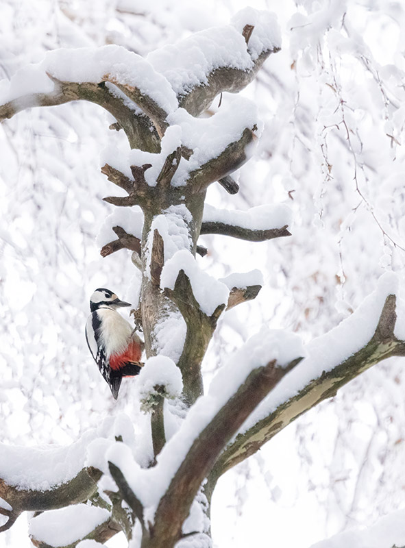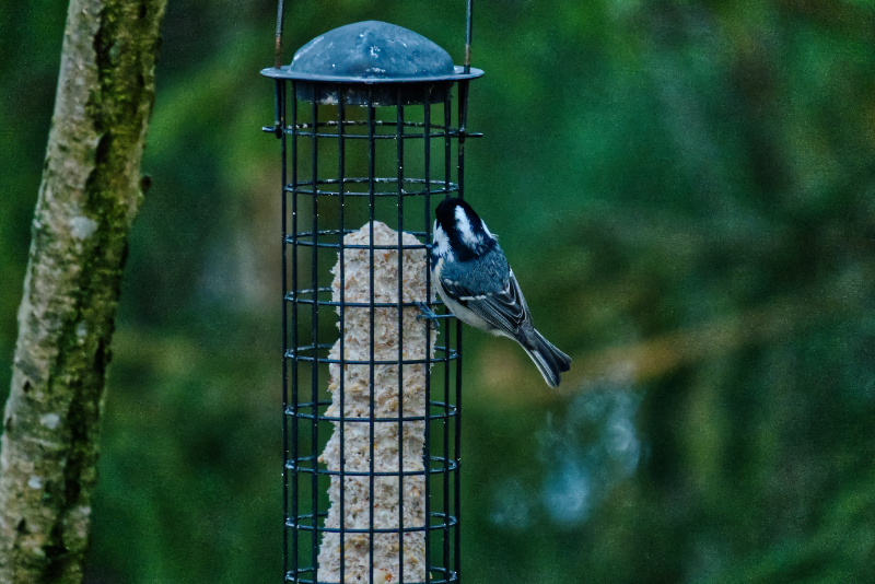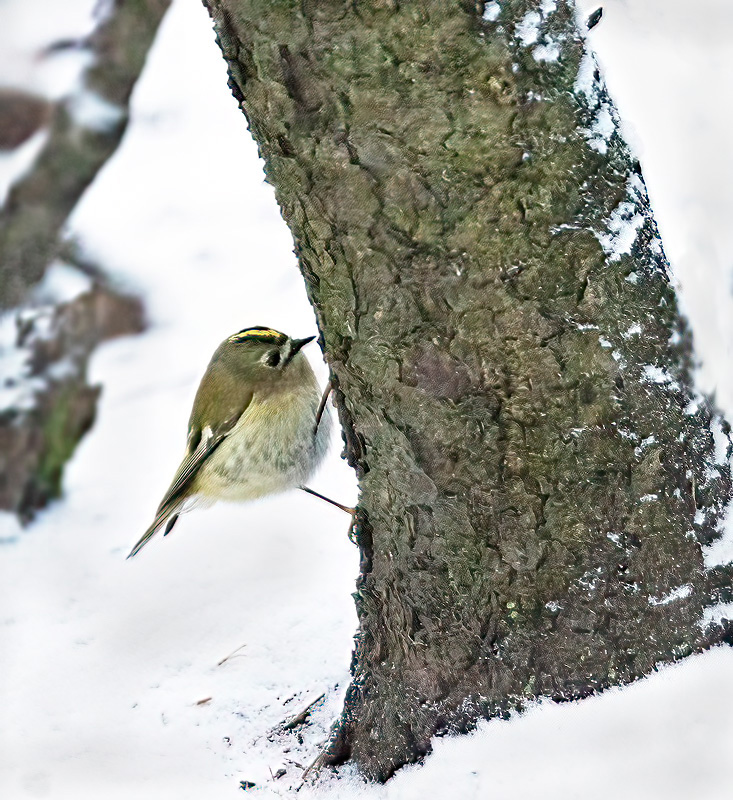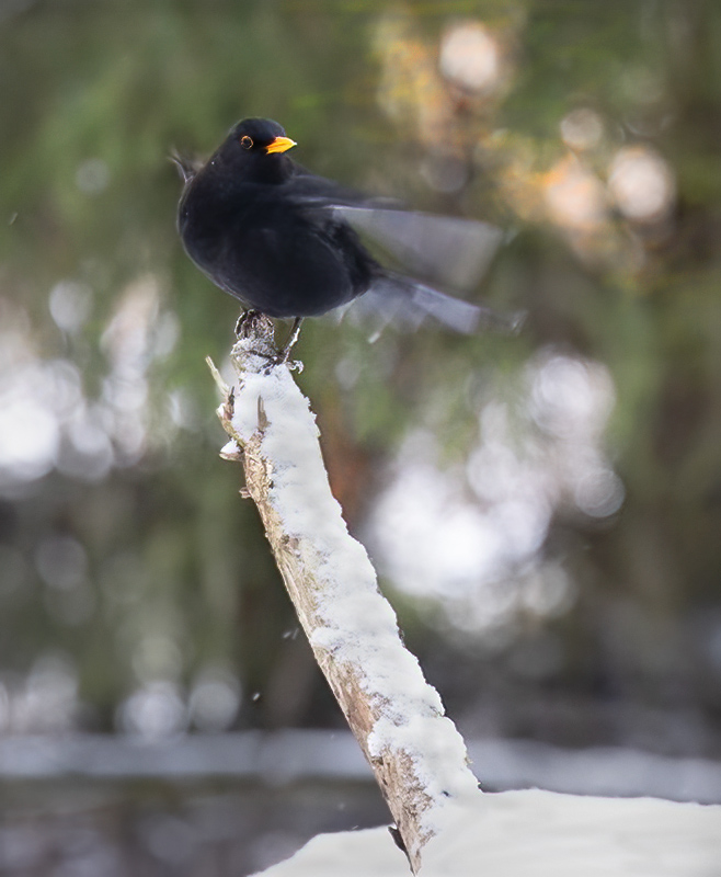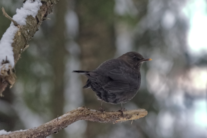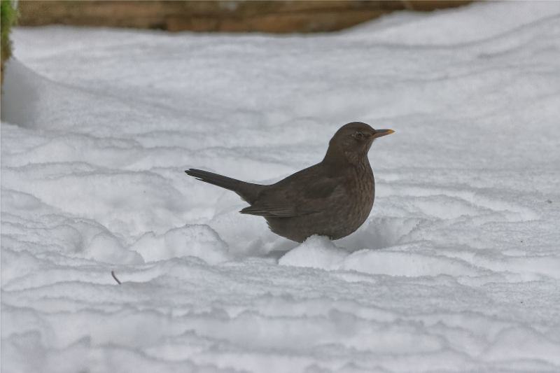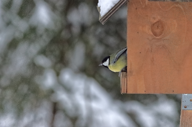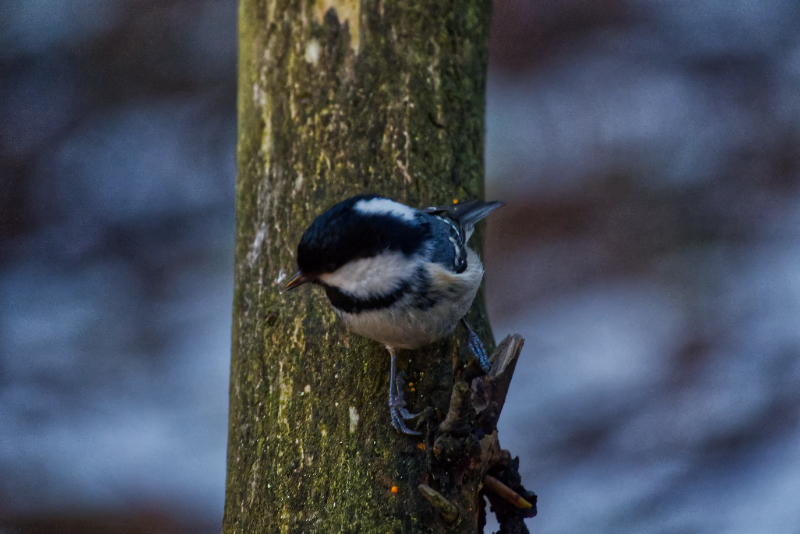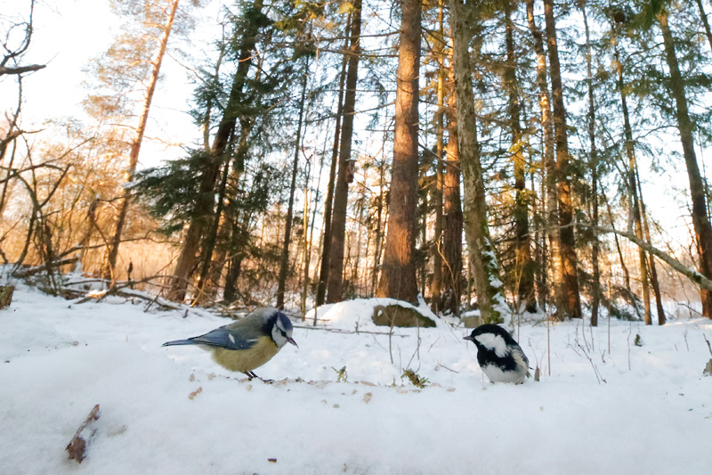 Lumitilanne ja sen muutos näkyy hyvin ruokintapaikalta otetuissa kuvissa. Ruokintapaikalla pääosin tiaisia ja mustarastaita. Kuusitiaisia yllättävän runsaasti. Kuusitiainen on utelias, tuli useaan kertaan tuijottamaan kuvaajaa lähelle.