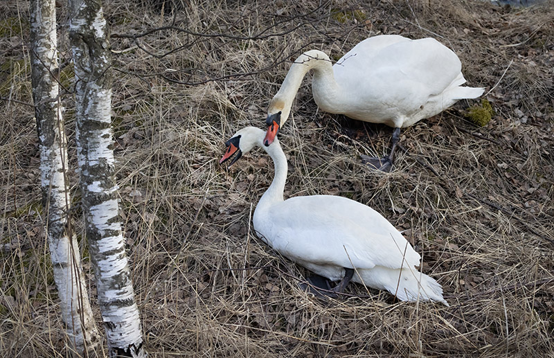 Näytti siltä, että vieraalle käy tosi kehnosti. En malttanut olla puuttumatta tilanteeseen ja keskeytin taiston. Reviirin haltija palasi sitten veteen. Vierailija jäi koivikkoon, ja oli vielä ainakin puolitoista tuntia myöhemmin siinä. Joutsen ei pääse metsiköstä suoraan lentoon, vaan lähtee pitkällä kiidolla mieluiten veden päältä. Lintu lienee jäänyt odottamaan, että reviirinhaltija ui näkymättömiin ennen kuin uskaltautuu liikkeelle.