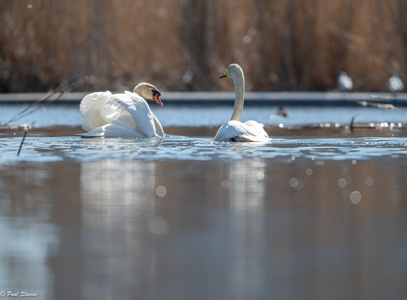 Kyhmyjoutsenpari on sommitellut pesää pariinkin paikkaan, mutta näyttää nyt päätyneen länsialtaan perukan ruovikkoon. Pesärakennelma näkyy kävelytieltä. Sunnuntai-iltapäivällä länsialtaalle ilmestyi toinen kyhmyjoutsenkoiras. Siitäkös reviirin haltija kimpaantui ja lähti takaa-ajoon, joka poikkeuksellisesti jatkui kymmeniä metrejä maalla.