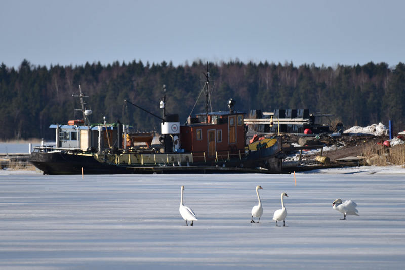 Ensimmäiset naurulokit myös lentelevät altaan päällä mutta eivät vielä laskeudu ja menevät yöksi merelle. Kyhmyjoutsenpariskunta kävi muutamana päivänä myös tarkistamassa onko sulia paikkoja mutta uskaltautuivat jäädä vasta sunnuntaina paikan päälle. Nuottalahti on vielä tiukassa jäässä, siellä on lisää kyhmyjoutsenia vaikka finnoonpuron laskusuulla ei ole edes sulapaikkoja.
