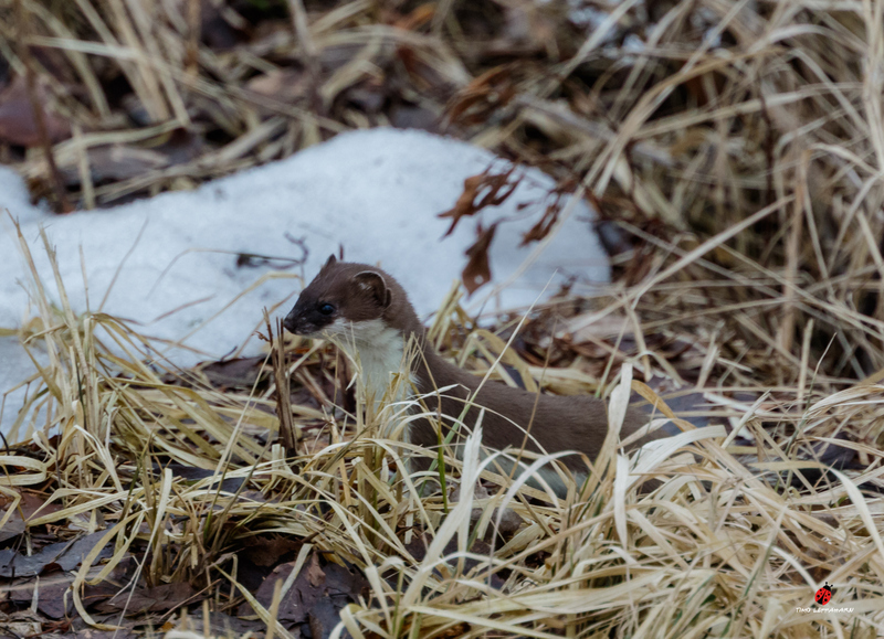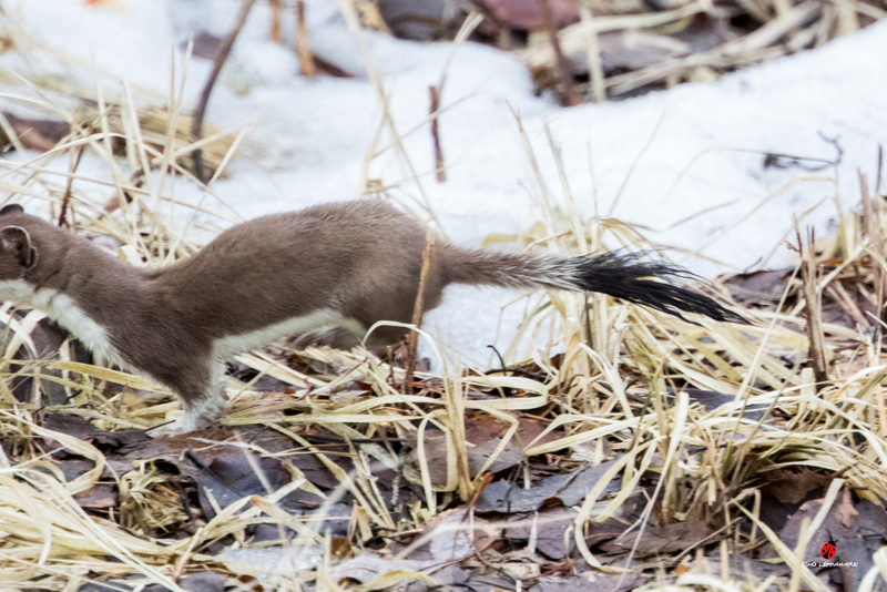 Kärppä oli vaihtanut asunsa jo kesäpukuun, niin vikkelästi juoksi polun yli että vain hännän musta tupsu jäi toiseen kuvaan.