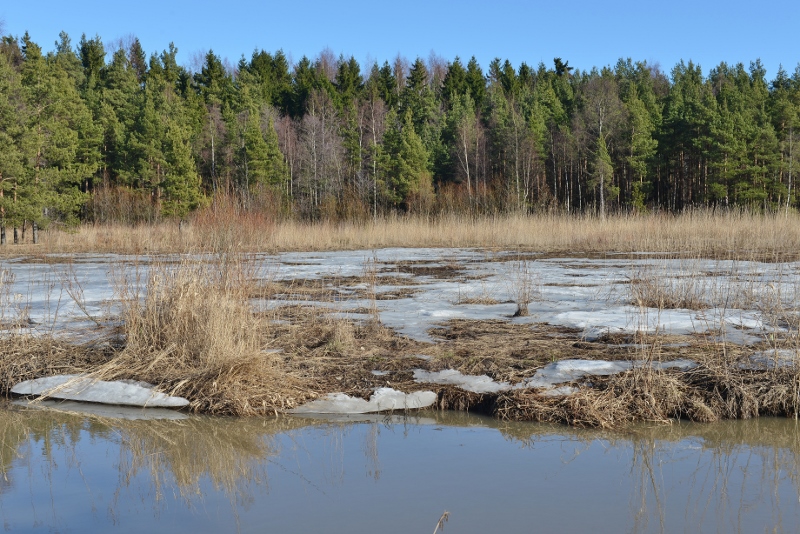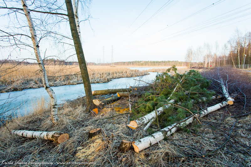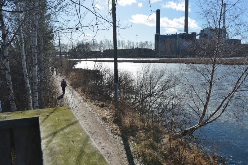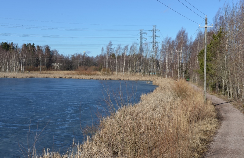 Otsikko voi olla liian optimistinen – takatalvi yllättää kuitenkin. Mutta kuitenkin, aurinko tuli esiin pitkän harmaan ja pilvisen jakson jälkeen. Oli lämmintä, mutta tuulista. Aurinko, lämpö ja tuuli hävittävät jäätä nopeasti. Tulvaniityn teräsjää näyttää häviävän. Viikko sitten tulvaniityllä oli mahdollista ”luistella”. Nyt on jo paljon sulia kohtia. Myös altaan jää näyttä hauraalta ja häviää ”silmissä”. Puron suun sulassa linnut odottavat: kyhmyjoutsen pari, telkkiä, sorsia. Sorsat käyttävät hyväkseen sulana virtaavaa puroa. Leppän norot ovat näkyviä.