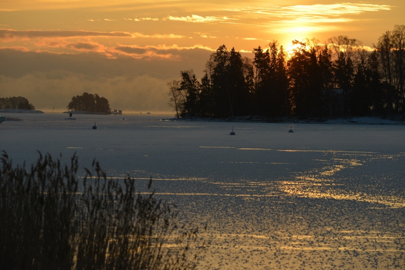Toinen iso asia oli meren jäätyminen. Pakkasta oli reilusti koko viikon, parhaimmillaan jopa -15 tai enemmän, mikä mahdollisti meren nopean jäätymisen. Sunnuntaina mitattiin Ryssjeholmenin ja Suvisaariston välissä jään paksuudeksi mitattiin 15cm. Aika kova lukema, kun ottaa huomioon, että pakkasta on ollut vain viikon päivät ja merivesi lienee ollut poikkeuksellisen lämmintä. Mutta kuitenkin pitää olla tarkkana. Lunta on edelleen vähän, oikeastaan vain nimeksi. Siksi jää oli luistelulle ihanteellinen. Niinpä retkiluistelijat ilmaantuivat runsaslukuisesti meren jäälle. Ja tietysti pilkkijät ja verkojen kokijat olivat myös paikalla.
