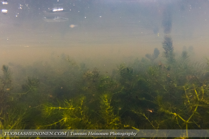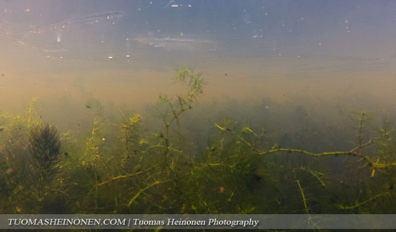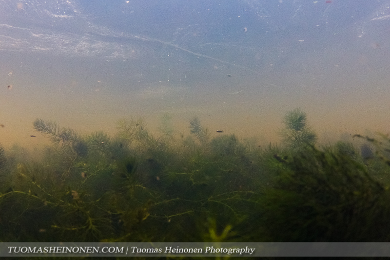 Hentokarvalehti on laskeutunut pinnasta pohjaan eikä enää näy samalla tavalla mattoina pinnassa kuin keväällä ja kesällä. Siellä se kuitenkin edelleen on. Pieni jääpeite rajoitti valoa pinnan alla.