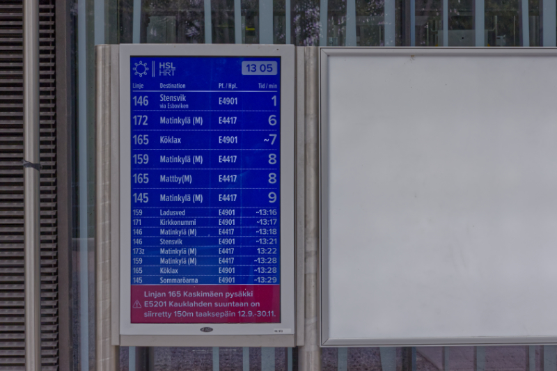 Kuriositeettina todettakoon, että Finnoon metroaseman sisäänkäynnin viereen on lisätty aikataulunäyttö, jossa on bussiaikataulut.