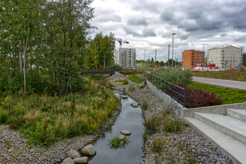 Finnoonsillan ja Rusthollarinkadun väliin nousee taloja, vain Kierrätyskeskus on toistaiseksi toiminnassa.