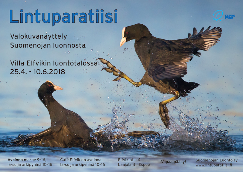 Lintuparatiisi-näyttely on esillä Luontotalo Villa Elfvikissä 25.4.2018-10.6.2018. Lintuparatiisi-kirja on myynnissä Luontotalon kaupassa.