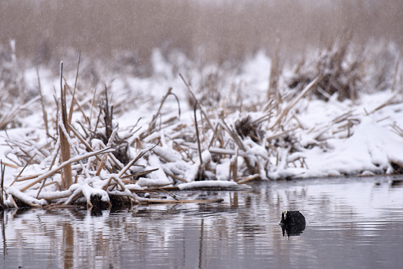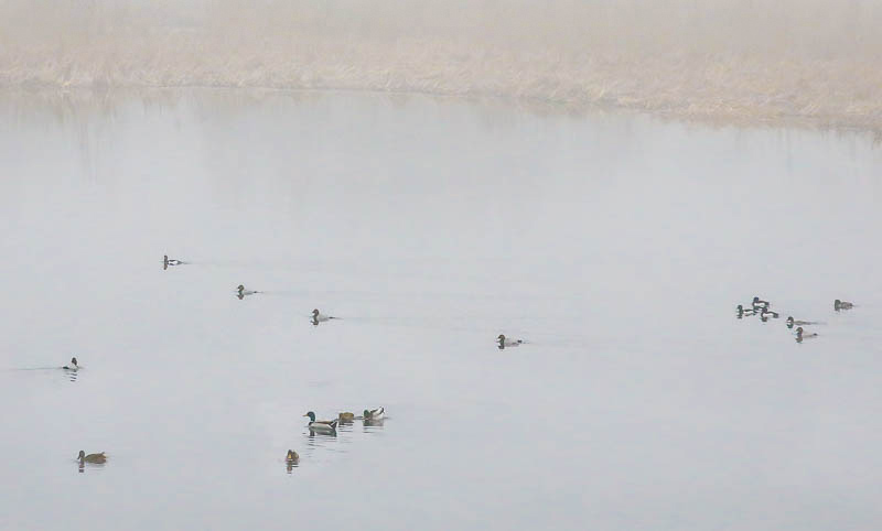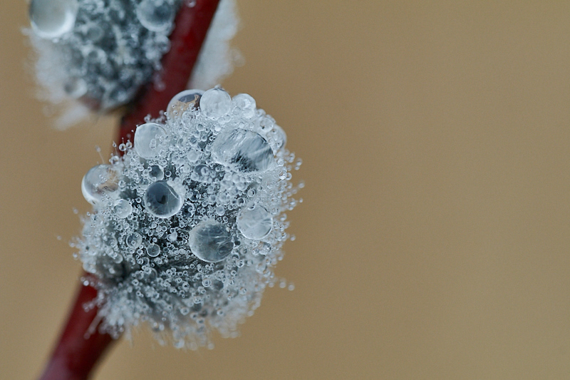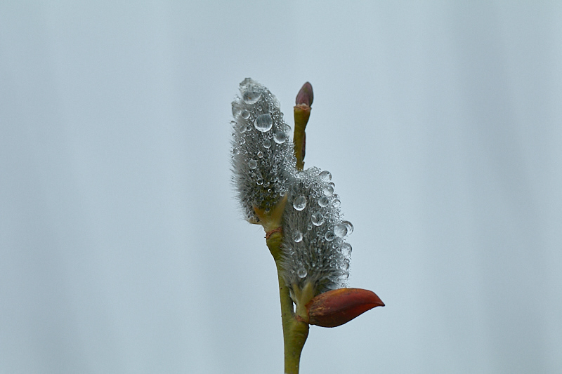 Viikon kuluessa altaan jää hupeni nopeasti ja keskiviikkona eteläinen osa oli lähes jäätön. Itäiseen osaa tuli sulia, joihin heti ilmaantui lintuja. Perjantain vastaisena yönä tuli kuitenkin noin 5cm lunta ja maisema muuttui valkoiseksi. Lumi kuitenkin suli sunnuntaihin mennessä ja sunnuntaiaamu oli maaginen. Sumuinen maisema, sulanneen lumen, vesisateen ja sumun seurauksena puissa ja kasveissa oli aika erikoisia pisarakoristeita. Näistä esimerkkinä galleriassa ovat pajunkissat ja korallikanukka.