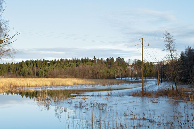 Vuoden ensimmäisen maanantain lumipyry toi lunta Suomenojalle. Vaikka lämpötila kääntyi plussalle, oli tiistaina lumesta vielä rippeitä jäljellä. Merivesi pysyi korkealla ollen ajoittain jopa metrin verran normaalia korkeammalla ja luhta sekä laiduniitty pysyivät veden – tai alkuviikosta pikemmin jään – peittämänä. Alkuviikosata talitiaset katsastelivat pesäpönttöjä veivät pesäaineksiä pönttöihin. Lämmin sää taitaa sotkea luonnonkelloa.