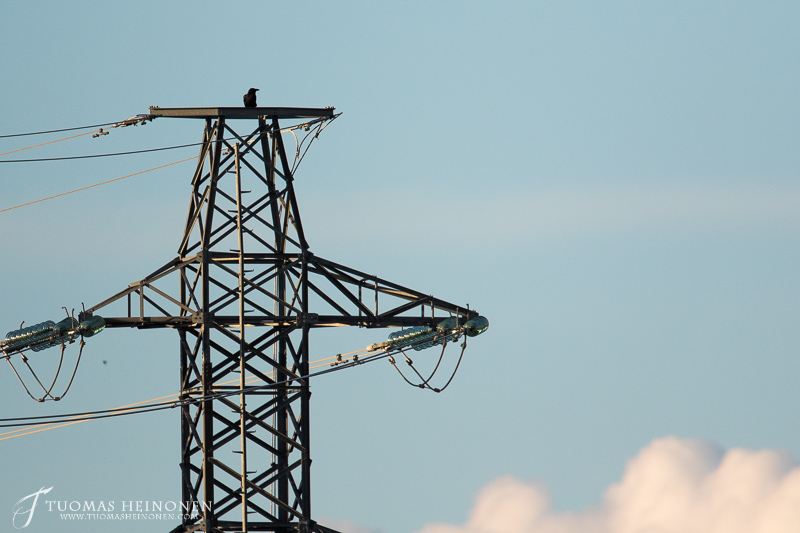 - Yksinäinen korppi voimapylväällä – Kuva: Tuomas Heinonen