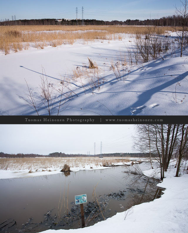 Tänä keväänä, kun allasta katsoo tarkalleen vuotta myöhemmin niin sulasta ei ole tietoa. Lunta on useita kymmiä senttejä ja pakkasta öisin -15-20 astetta. Päivisinkään lämpötila ei mene plussalle, onneksi edes kevätaurinko lämmittää.