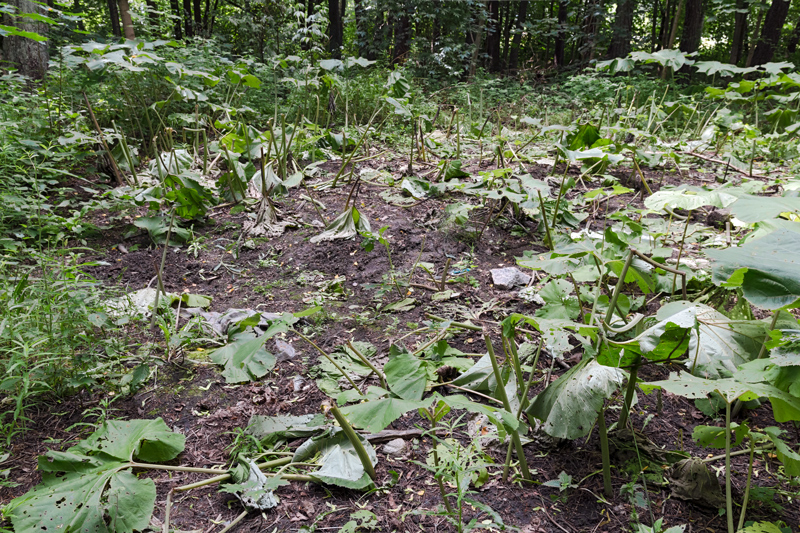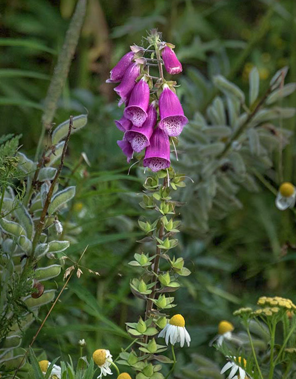 Kasvimaailma näyttää ainakin osin pitävän kosteudesta. On vehmasta ja useat kasvit kukkivat runsaina, vaikka kukinta tapahtuu pari viikkoa normaalia myöhemmin. Ilahduttavaa on se, että sormustinkukka on palannut lähelle alkuperäistä kasvupaikkaa. Sehän hävisi kevätesikoiden kanssa maaperätutkimuksen yhteydessä ja siihen liittyvissä maan siirtelyissä. Edellisten vuosien tapaan joku on hermostunut japaninruttojuuriin ja telonnut ne taas maan tasalle.