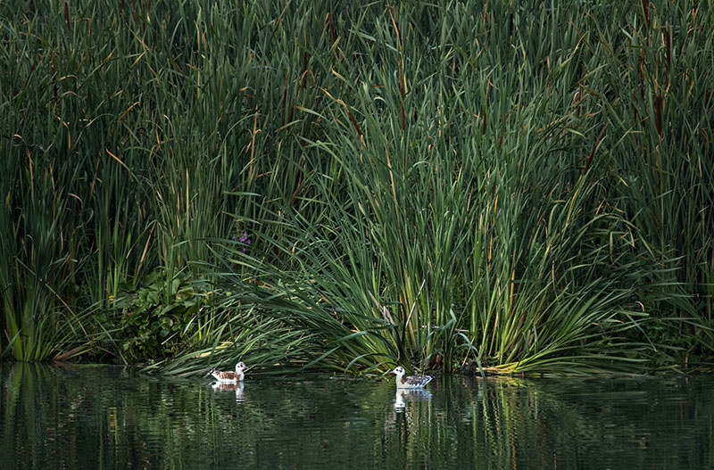 Lintuallas on jo hyvin hiljainen. Yksittäisiä naurulokin poikasia vielä näkyy altaalla. Myös myöhäinen tukkasotkapoikue uiskenteli emonsa kerä. Lentokykyisiä nämä ovat vasta kesän kääntyessä syksyyn. Piisamin saattaa nähdä ruuan hakumatkalla.