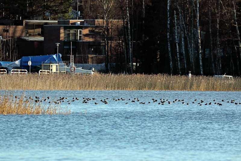 Nuottalahdella on taas satoja tukkasotkia. On komeaa kuultavaa, kun muutaman sadan linnun parvi saapuu ja loiskauttaa veteen. Hetken luulin, että kyseessä olisi jokin erikoinen vene, kunnes tajusin mistä oli kyse. On sääli, jos kaupunki tuhoaa tämän kokoontumispaikan utopistisilla suunnitelmillaan. Ruokintapaikalla oli hippiäinen ja varpushaukka kävi päivystämässä.