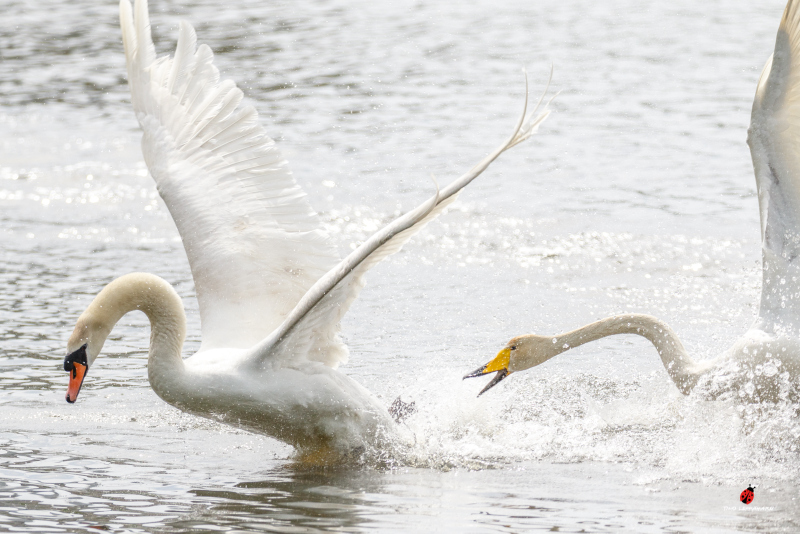 - Laulujoutsen takaa-ajaa kyhmyjoutsenta – Kuva Timo Leppäharju
