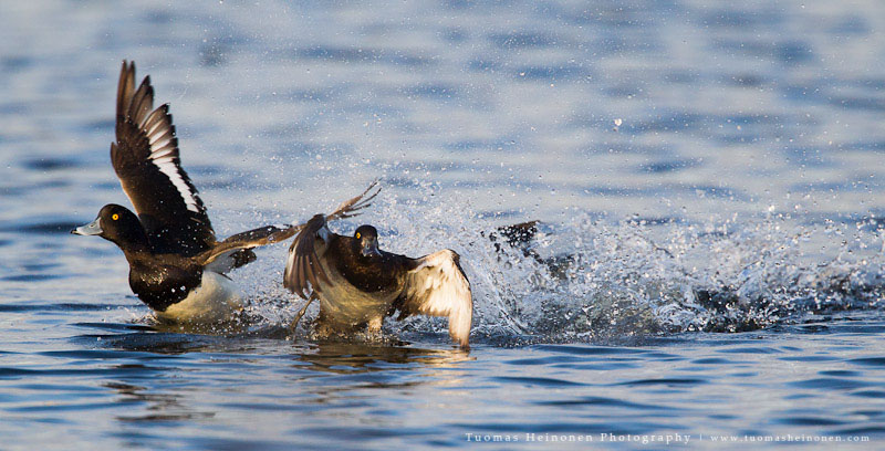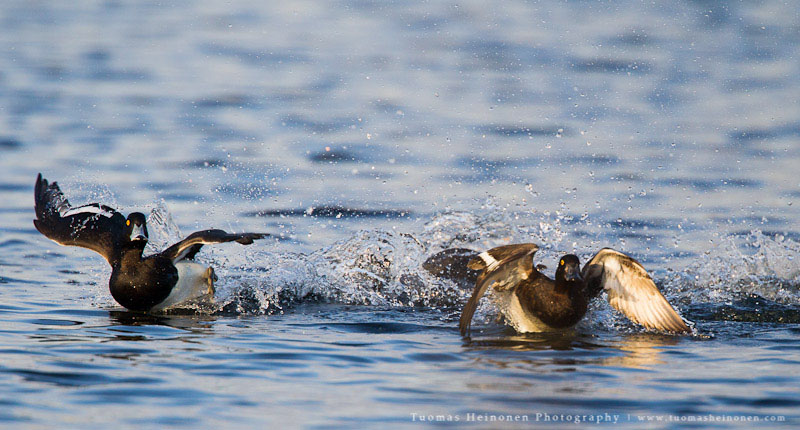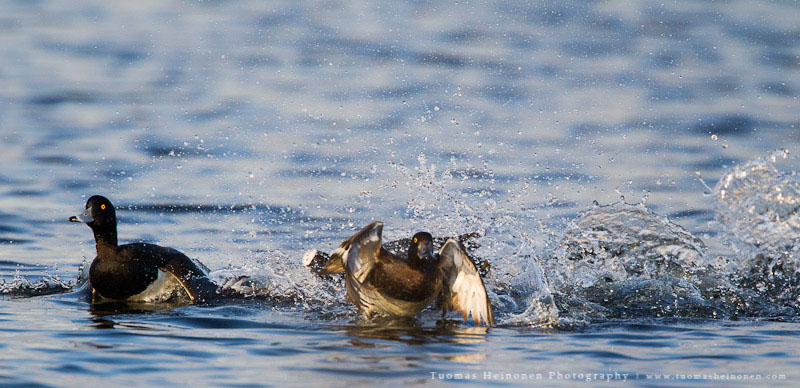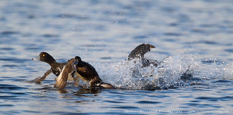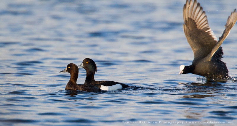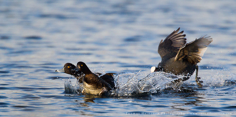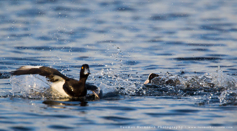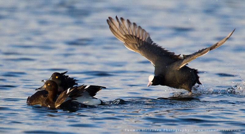 Reviirikiistoissa saattaa usein olla naapurit tiellä tai sitten vain naamat muuten ärsyttää. Ainakin tätä nokikanaa raivostutti hänen vesineliöillä oleskelevat naapurit. Lähtöpassit sai tukkasotkat, telkät, piisami sekä lajikumppanit.
