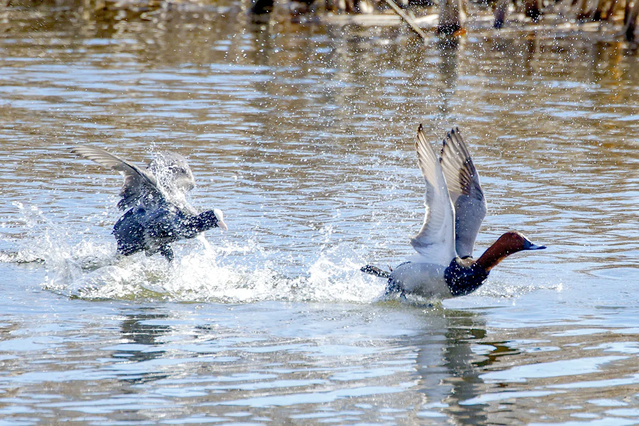 - Nokikana hätyyttää punasotkaa – kuva Mehmet Cadiroglu