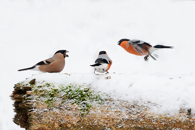 Ruokinnalle oli vilskettä. Tiaisia ja mustarastaita riitti. Ajoittain paikalla oli runsaasti punatulkkuja. Niillä on mielenkiintoinen tapa: kun pyrähtää lentoon, koko ryhmä seuraa perässä. Kohta tulevat taas takaisin parvena.