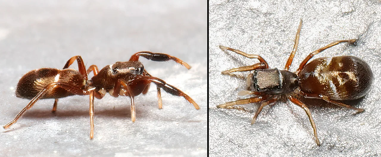 Pitkästä aikaa näin taas viholaishypykin, oikeastaan viholaishypykkejä. Niitä oli ainakin kuusi pienellä alueella. Viholaishypykki muistuttaa erehdyttävästi muurahaista ja matkii myös liikkeillään muurahaista. Heiluttaa etujalkojaan kuin ne olisivat tuntosarvet. Naaraat ovat 3,5–4 mm kokoisia (sokerimuurahaisen koko). Viholaishypykki saalistaa kuivilla hiekkaisilla niityillä ja matalan kasvillisuuden seassa. Tässä tapauksessa ne olivat sinkityllä rautakaiteella.