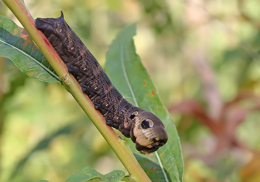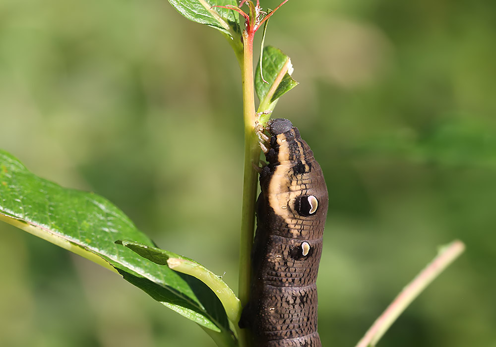 Löysin lisäksi vielä noin kymmenen horsmakiitäjän (Deilephila elpenor) toukkaa. Ne ovat isokokoisia, komeita toukkia, ja myös aikuinen perhonen on todella kaunis. Toukan niska (segmentit 1-3) on paksu ja siinä on neljä silmätäplää, joiden tarkoitus on säikäyttää mahdolliset viholliset. Varsinainen pää silmineen on suhteellisen pieni.”