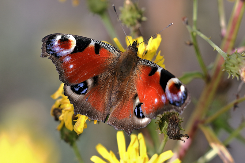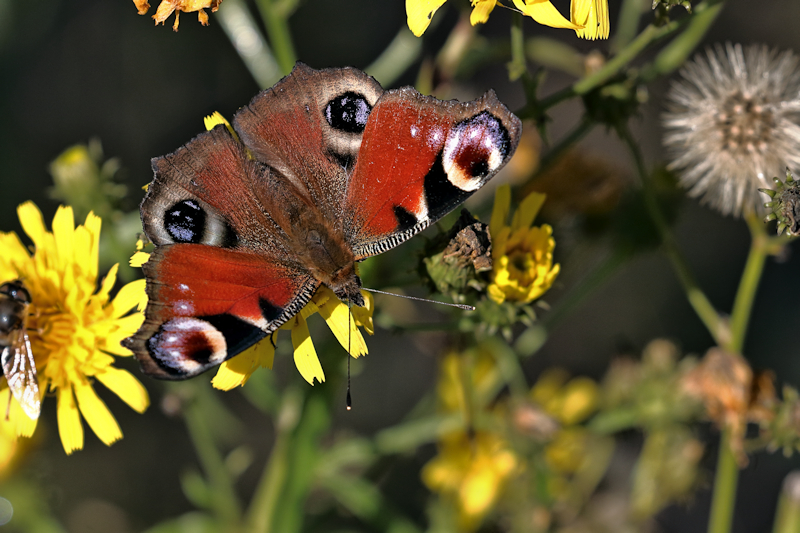 En (JR) ole sitten kesän 2011 nähnyt yhdellä silmäyksellä Suomenojalla niin paljon pehosia kuin keskiviikkona ja torstaina kuluneella viikolla. Erityisesti parkkipaikan ja altaan välisellä täyttöalueella oli kymmeniä neitoperhosia, paljon ohdakeperhosia ja joukossa myös kaaliperhosia – siis myös vaeltajia. Paljon oli myös läjityspaikan takana ja metsiköiden välisillä niittyalueilla. Yllätys oli kaaliperhonen, jota ei ole muutamaan vuoteen havaittu. Tänä vuonna niitä on ollut liikkeellä hivenen runsaammin asiantuntijoiden havaintojen mukaan. Tuntuu hivenen kummalliselta, että perhosten runsaus todetaan syyskuun toisella viikolla. Tämän kesän kuva.