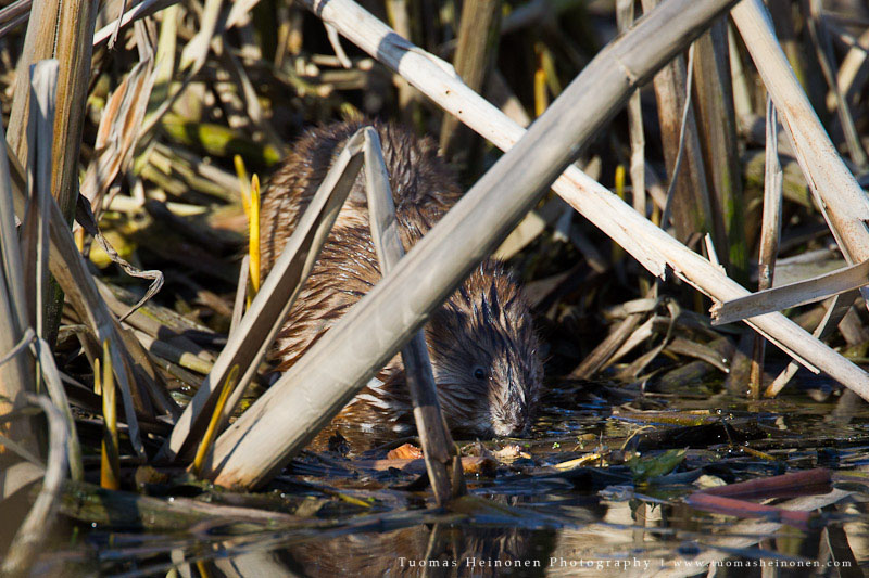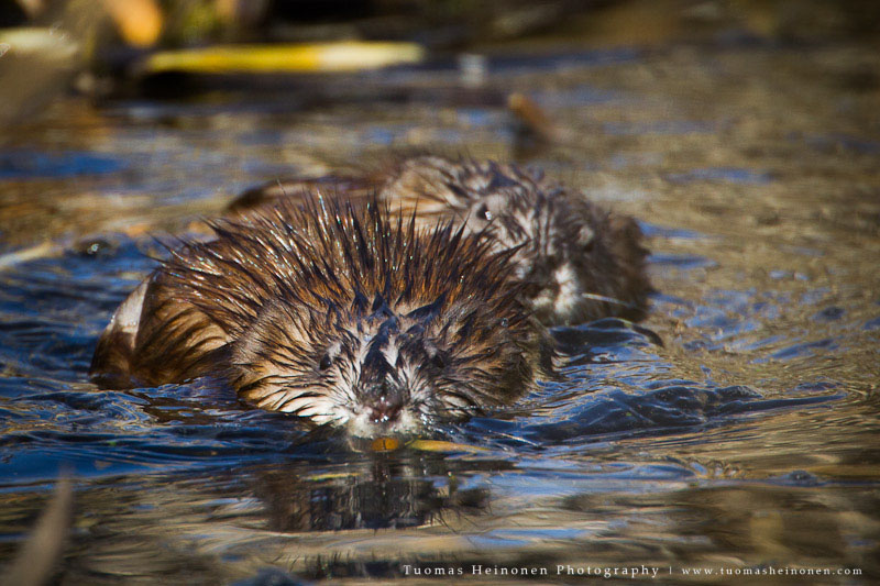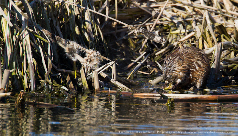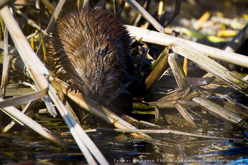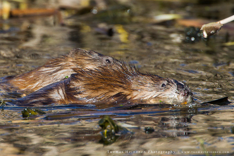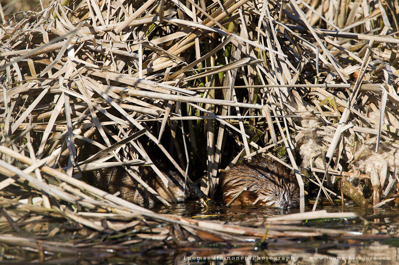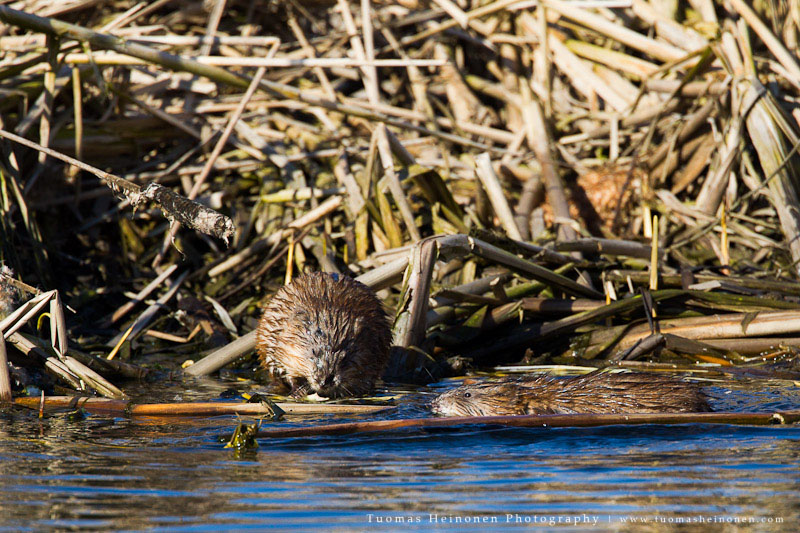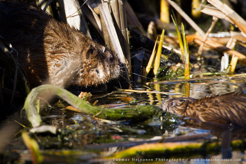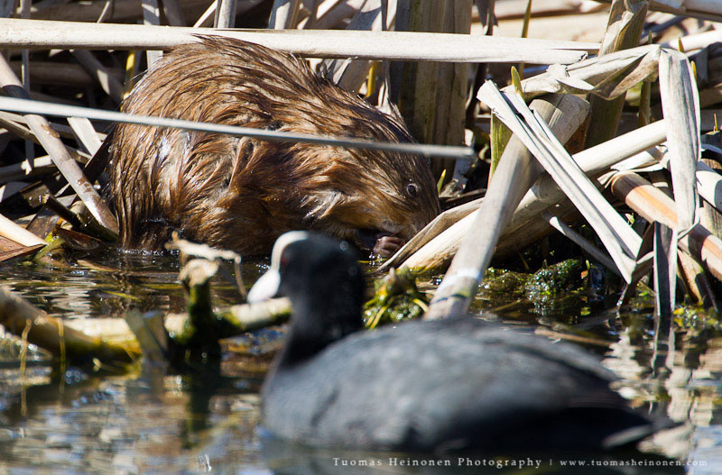 Piisamit olivat aktiivisena ja hyvin esillä lauantaina (28.4.). Olen käynyt huhtikuussa 12 päivänä vähintään kerran altaalla enkä ole nähnyt vastaavaa aktiivisuutta minään muuna päivänä kuin tänään aamupäivällä. Kaksi piisamia pyöri lähellä polkua uiden ja kirmaten välillä ruovikossa ns. kuivalla maalla. Taisi olla kevättä rinnassa, koska lemmenleikkejä päästiin myös seuraamaan polulta.